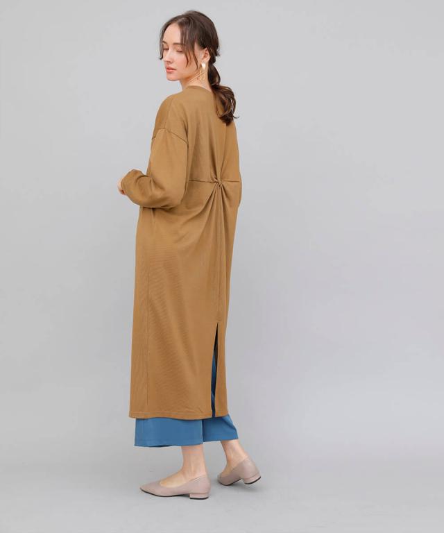 後ろに向けばバックスタイルが捻りデザインで仕上げられた今期らしいシルエット。タイトすぎず、スリット入りなので、長い丈でも軽やかに動きを演出してくれます。