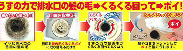 ●うずの力で排水口に集まった髪の毛やゴミを簡単に捨てる事ができます。