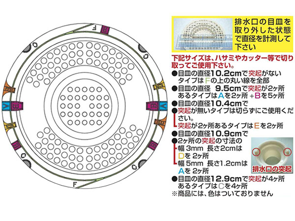 ※使用可能な排水口の直径は9.5cm・10.2cm・10.4cm・10.9cm・12.9cmです。