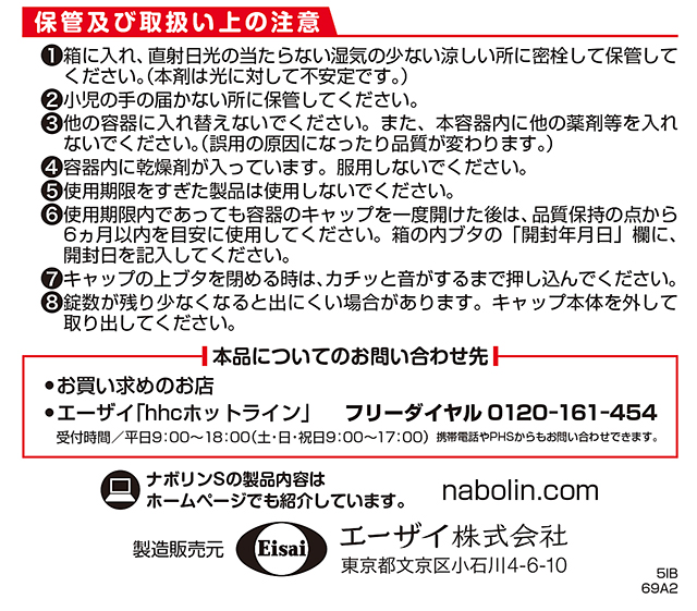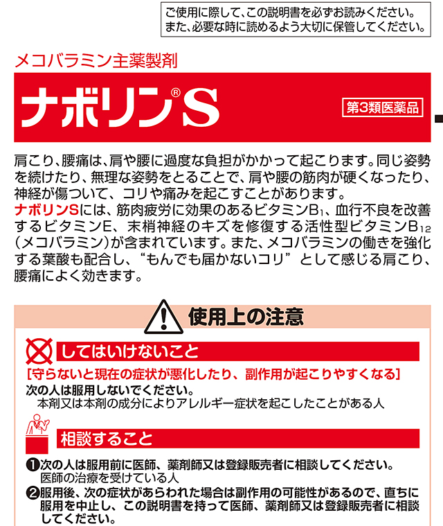 商品名 第3類医薬品 ナボリンS 40錠 セルフメディケーション税制対応商品 エーザイ 容量 40錠 JANコード 4987028146605 メーカー エーザイ カテゴリー 医療・介護・医薬品>医薬品>栄養補助>栄養補助【第三類医薬品】 効果・効能 次の諸症状の緩和:眼精疲労、筋肉痛・関節痛(腰痛、肩こり、五十肩など)、