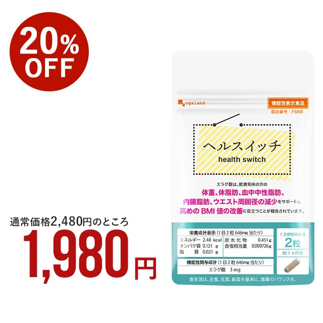 【セール】【機能性表示食品】ヘルスイッチ(約1ヶ月分) エキス由来 エラグ酸 健康 美容 BMI ダイエット 体脂肪 中性脂肪 サプリ サプリメント ブラックジンジャー 送料無料 オーガランド ウエスト 【M】_JB_JD_JH _1K 19034