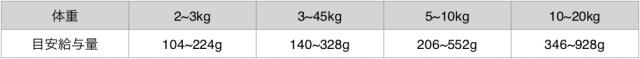 ・給与量はあくまで目安です。愛犬のサイズ、犬種、消費カロリー、妊娠中や授乳中など状況によって異なります。