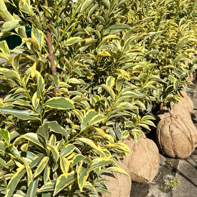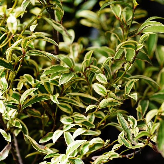 年間を通してクリーム色の斑入り葉が楽しめます。日陰にも強く、刈り込みにも強いので、北側の生垣を明るくできたり、シェードガーデンにもおすすめ。