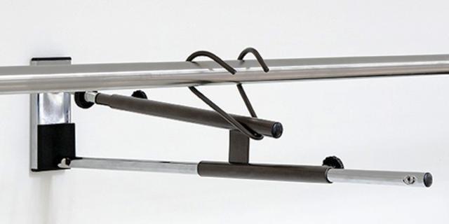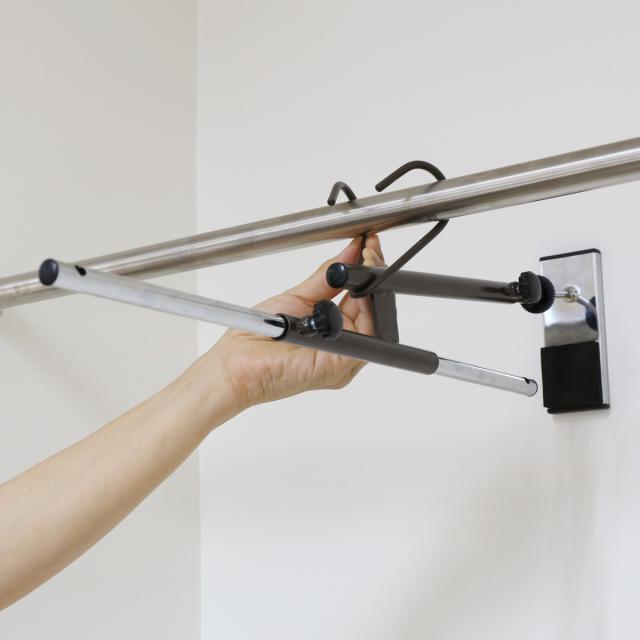 掛けた物を使用する時は、スライドパイプを引いて素早く取り出せます。使用後は押すだけで簡単に収納できます。壁側にはクッションゴムが付いているので押す時も衝撃が少なく安心です。
