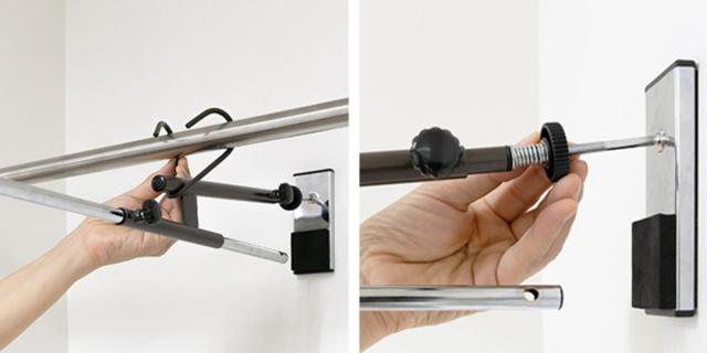 | (1)つまみネジを仮止めする | (2)つっぱりパイプを緩める |