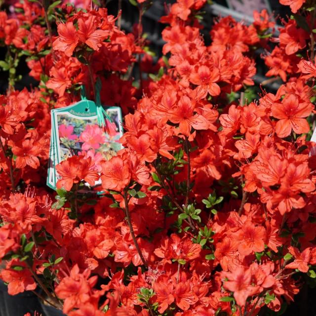 久留米ツツジの紅花品種で、とてもインパクトのある名前です。久留米ツツジの中では早く咲き、朱色がかった赤から咲き進むにつれてオレンジ色に変化します。生育旺盛で良く伸びるため、育てやすい品種です。