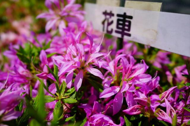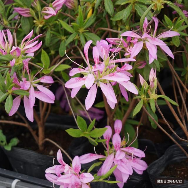 花車はモチツツジの園芸品種。花は4〜5cmのつつじにしては花弁が細い薄紫色の花で、非常に花つきが良いです。葉もツツジ類の中では大型で、枝は分枝して株立ち状になります。葉の色は明るい黄緑色系で、やさしい花色によくあいます。モチツツジの園芸品種と言われますが、商品のラベルではヒラドツツジと記載してあります。