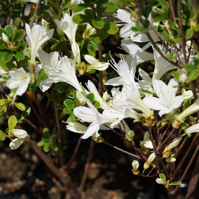 全体的にコンパクトな樹形に仕上がるため、鉢植えなどに適しています。花は小輪ですが花付きが素晴らしく良いです!耐寒性はヒラドツツジよりありますが、根腐れしやすいため注意が必要です。