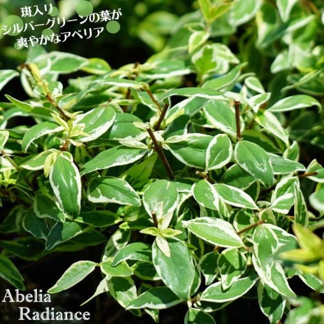 アベリア「ラディアンス」は、グリーンの葉に細かく白い斑入りがなんとも爽やかなアベリアの新品種。お庭を明るく、爽やかに演出してくれます。