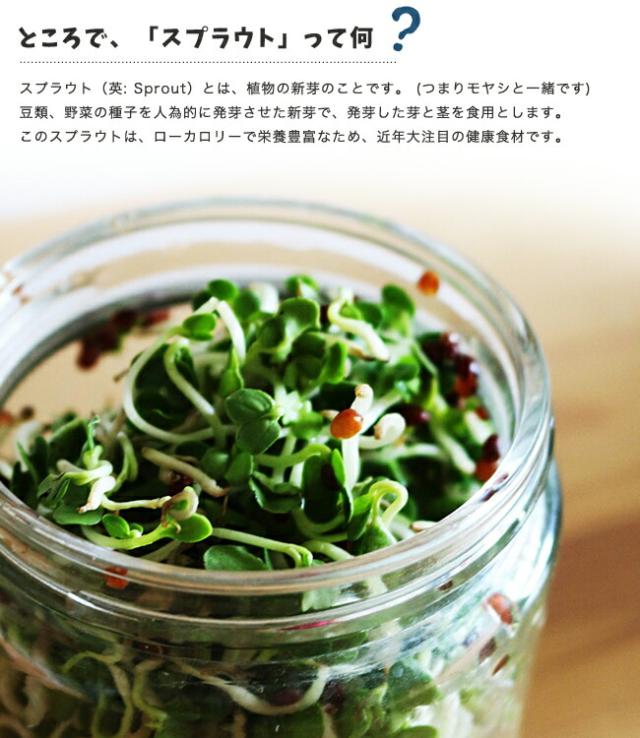 スプラウト栽培専用ジャーでタネを水洗いし、タネの2倍以上の水を入れ6〜12時間浸します。次の日から朝・晩タネを水洗いし、しつかリ水を切リます。7〜10日で収穫できます。