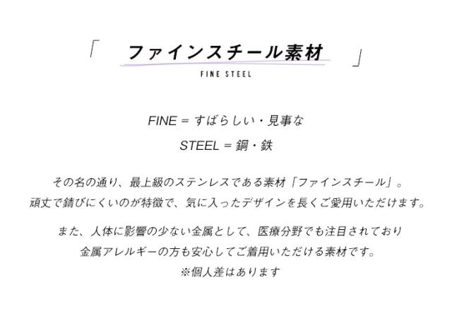 その名の通り、最上級のステンレスである素材「ファインスチール」。頑丈で錆びにくいのが特徴で、気に入ったデザインを長くご愛用いただけます。また、人体に影響の少ない金属として医療分野でも注目されており、金属アレルギーの方も安心してご着用いただける素材です。※個人差はあります。