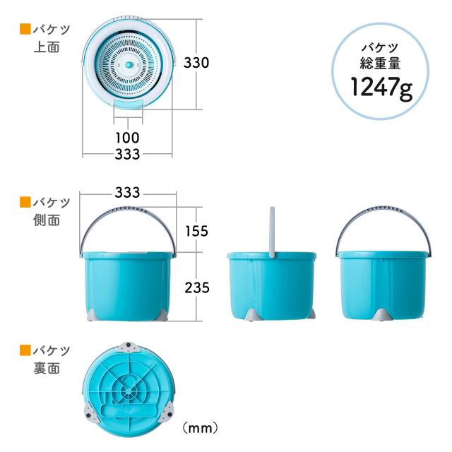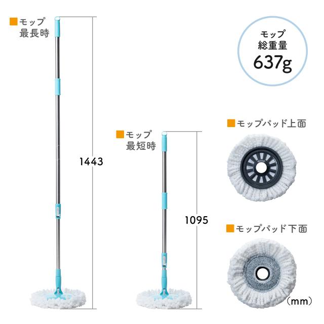 ■サイズ:モップ長さ/最短1095〜最長1443mm、バケツ/約W333×D330×H235mm(取っ手含まず)、モップパッド/約W255×D255×H112mm■重量:モップ/約637g、バケツ/約1247g、モップパッド/約183.5g