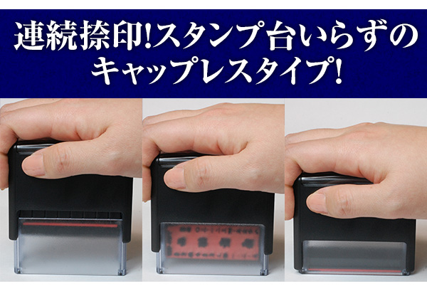 ![]() 1行ずつ分割、入れ替えできます | ![]() 握りやすいグリップできれいに押せるスタンプです | ![]() インクパッド内蔵で楽々連続捺印! |