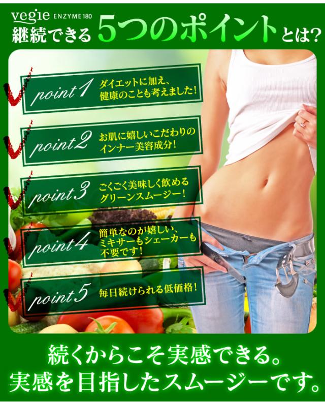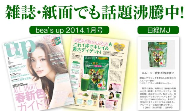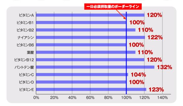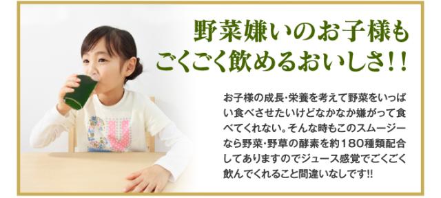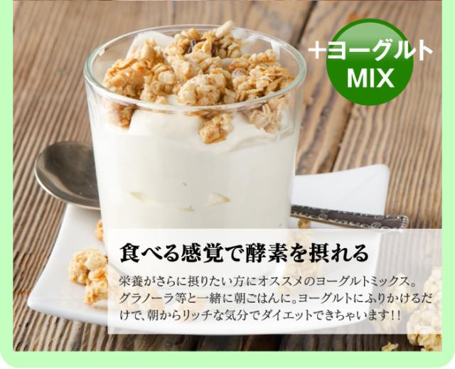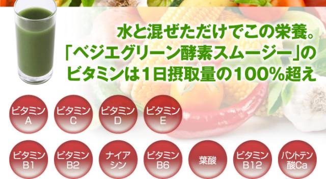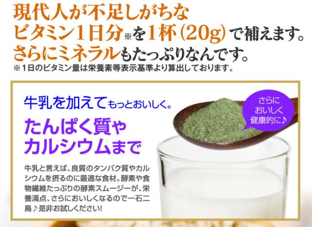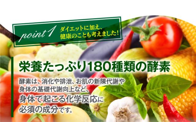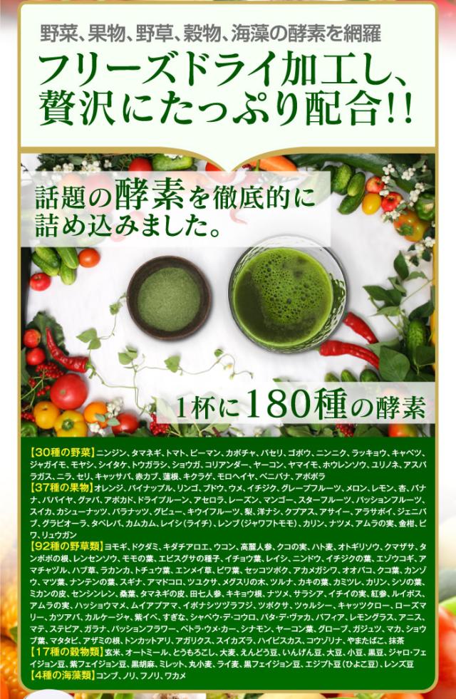 水溶性食物繊維、ブドウ糖、大麦若葉末、リンゴ果汁パウダー、バナナパウダー、ほうれん草末、野菜ミックスパウダー(大麦若葉、ケール、ブロッコリー、南瓜、チンゲン菜、パセリ、ニンジン、セロリ、苦瓜、ほうれん草、桑の葉、モロヘイヤ、よもぎ、トマト)、抹茶、コラーゲンペプチド、グルコマンナン、豚プラセンタ抽出物、穀物発酵エキス末、野草発酵植物エキス末(デキストリン、野草発酵エキス(オリゴ糖、砂糖、甜菜糖、よもぎ、うこん、黒砂糖、どくだみ、ハチミツ、高麗人参、その他))、植物発酵物乾燥粉末(デキストリン、黒糖、果実・野菜(オレンジ、パイナップル、バナナ、リンゴ、パパイヤ、グァバ、ニンジン、キウイフルーツ、その他))、野草エキス(パフィア、ローズマリー、カツアバ、紫イペ、キャッツクロー、その他)、穀物(玄米、インゲン豆、トウモロコシ、オーツ麦、大麦、エンドウ豆、カシューナッツ、黒ゴマ、キビ、大豆、ライ麦、その他)、海藻(わかめ、昆布、海苔)、ハチミツ)、植物発酵エキス(デキストリン、甜菜糖、黒砂糖、麦芽糖、よもぎ、うこん、どくだみ、ハスの葉、高麗人参、センシンレン、オトギリ草、クマザサ、タンポポの根、霊芝、アマチャヅル、トチュウの葉、オオバコ、甘草、松葉、南天の葉、アマドコロ、ツユ草、ツルナ、マカ、トンカットアリ、ハブ草、ハト麦、スギナ、ビワ葉、羅漢果、クコの実、レンセンソウ、桃の葉、イチョウ葉、ニンドウ、イチジクの葉、ベニバナ、エゾウコギ、エンメイ草、モロヘイヤ、セッコツボク、アカメガシワ、クコの葉、柿の葉、カミツレ、カリン、紫蘇葉、桑の葉、メグスリの木、田七人参、キキョウの根、ナツメ、マタタビ、エビス草の種子、紅参、アガリクス、ルイボス、アムラの実、タマネギ外皮、サラシア、キャッツクロー、梅、金柑、イチジク、みかん、パイナップル、リンゴ、グレープ、メロン、レモン、グレープフルーツ、杏、トウガラシ、生姜、椎茸、ニンジン、玉ねぎ、パセリ、キャベツ、ごぼう、もやし、にんにく、昆布、ふのり、大豆、コリアンダー、ピーマン、山芋、ほうれん草、いんげん豆、百合の根、黒小豆、アスパラガス、にら、せり、れんこん、きぐらけ、マンゴー、レイシ、パパイヤ、梨、バナナ、ビワ、グァバ、スターフルーツ、レンブ、パッションフルーツ、リュウガン、スイカズラ、ハイビスカス、こうぞりな、やまたばこ、抹茶)、パン酵母(マンガン、亜鉛、銅、モリブデン、ヨウ素、セレン、クロム含有)、増粘多糖類、甘味料(アセスルファムK、スクラロース)、V.C、香料、酸味料、V.E、ナイアシン、パントテン酸Ca、乳化剤、V.B1、V.B6、V.B2、V.A、葉酸、V.D、V.B12(原材料の一部に、小麦、ゼラチン、豚、大豆、やまいも、ごま、りんご、オレンジ、バナナ、キウイフルーツ、カシューナッツを含む)