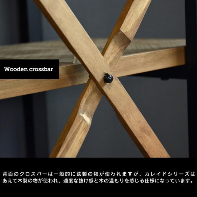 カレイドシリーズは三角形にカットした古材風のパイン材をジオメトリックに並べた、質感の高い天板・棚板に、無骨でシンプルなアイアンパイプを組み合わせたシリーズです。