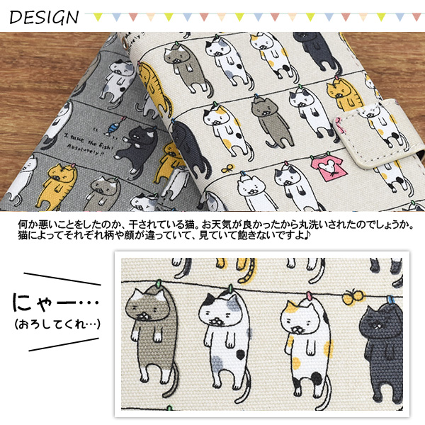 猫好きなら気に入ること間違いなし!!いっぱいの猫達が干されている柄の手帳型ケースです。