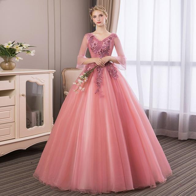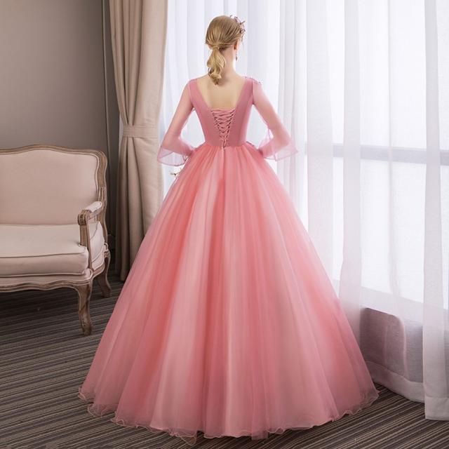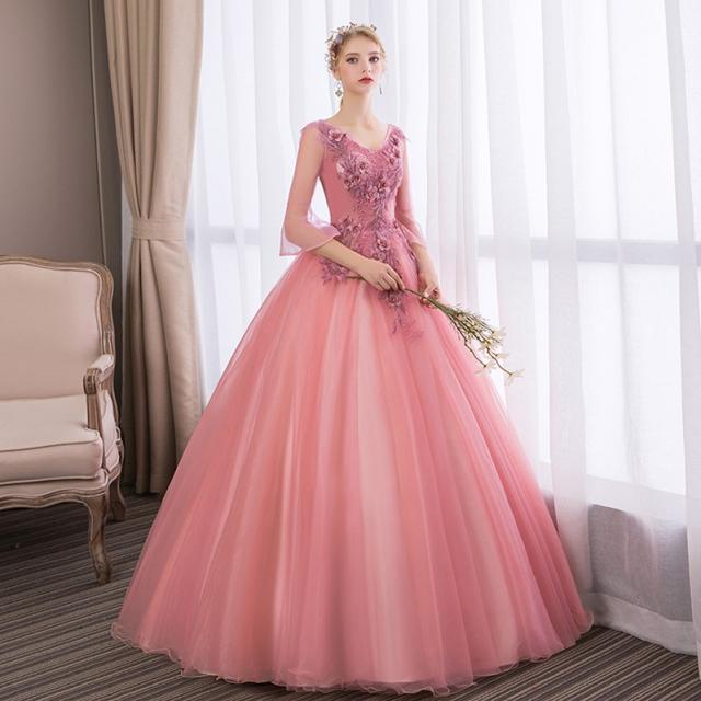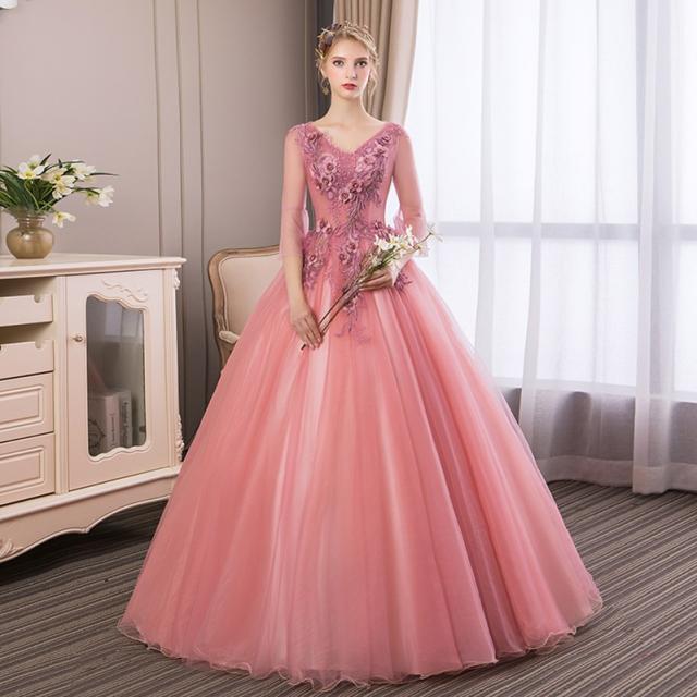 お得 パニエ付 カラードレス ロングドレス パーティドレス ワンピ Vネック 袖あり ピンク 結婚式 二次会 発表会 オーダーサイズ可 D165