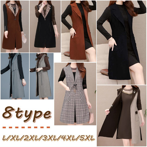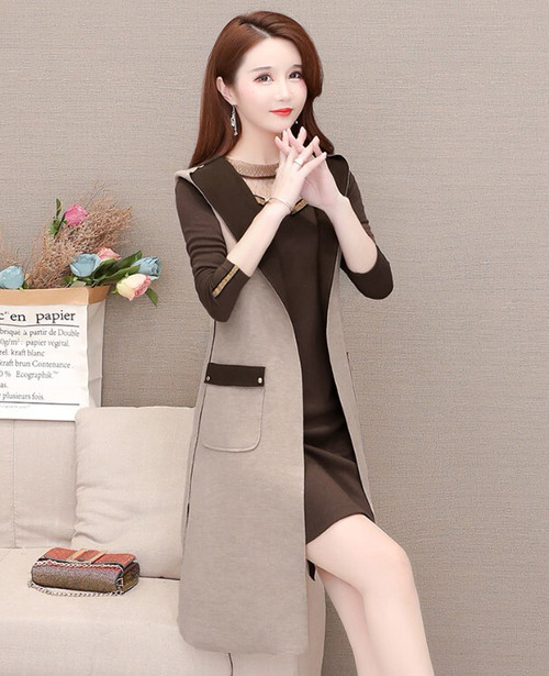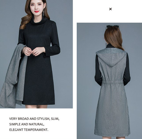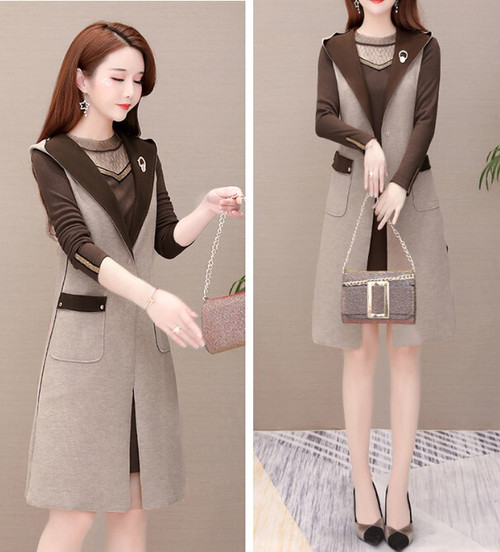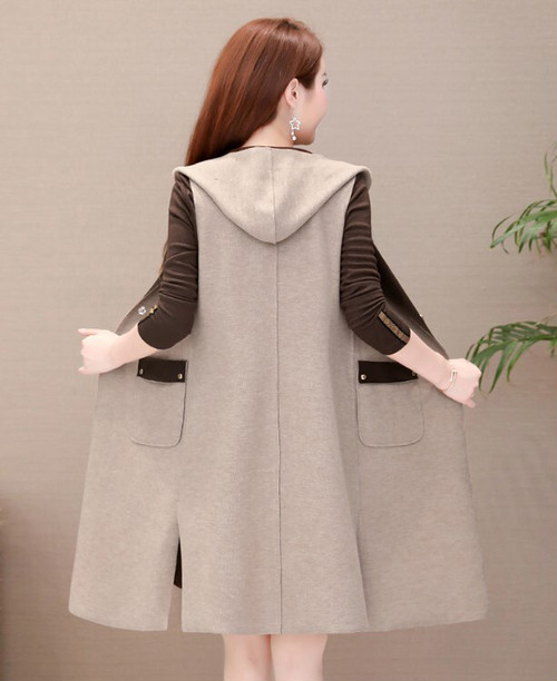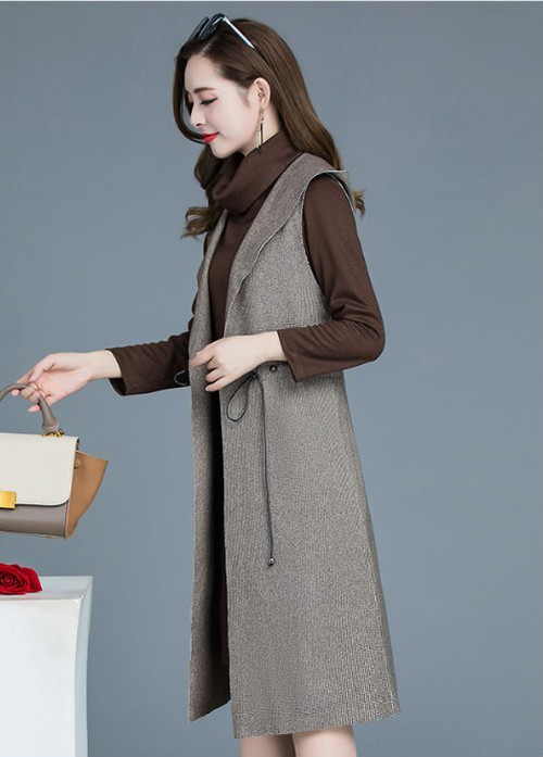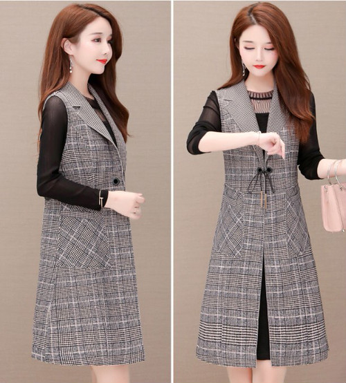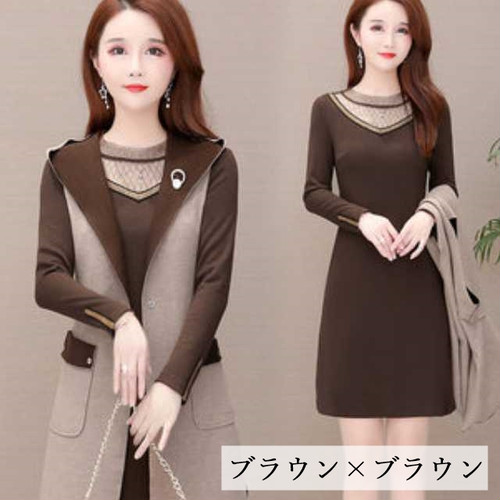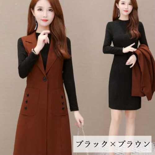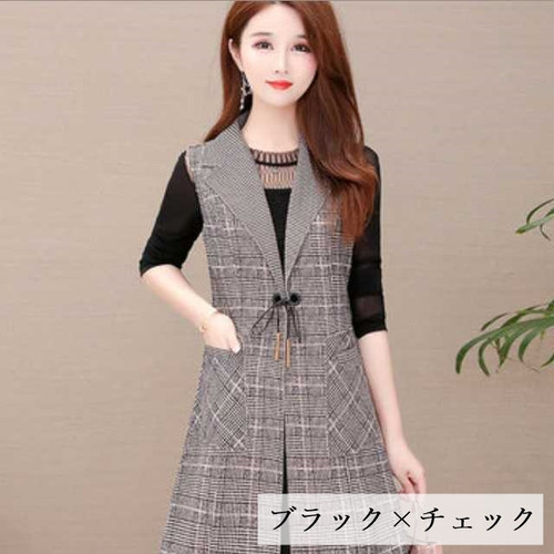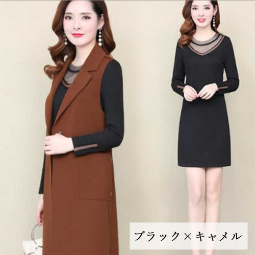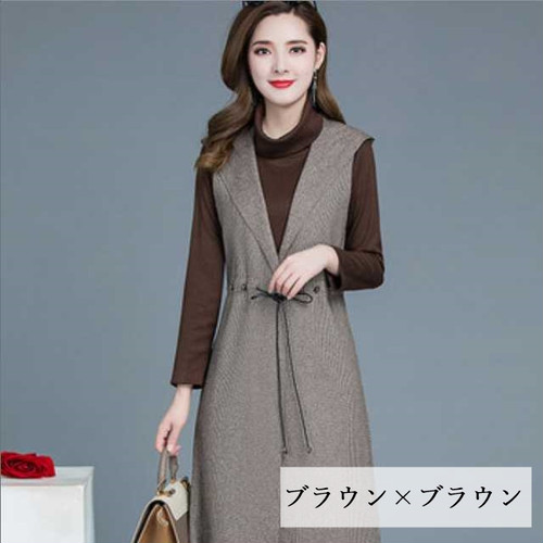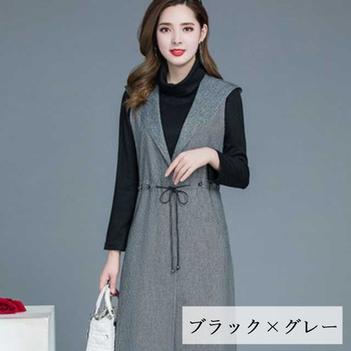 シンプルなチュニックとロングベストのセットアップ。