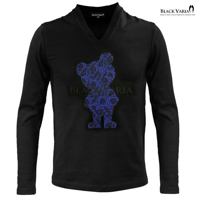 メール便可/1枚まで Tシャツ 長袖 Vネック 熊 クマ アニマル 動物 バラ 花柄 薔薇 メンズ(ブラック黒ブルー青) zkk068ls