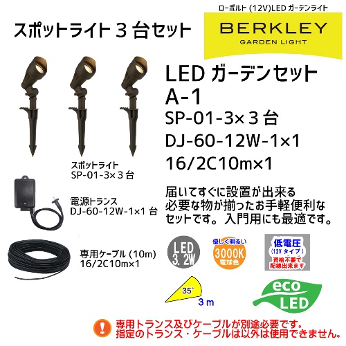 【バークレーローボルトLEDガーデンライトシリーズ】迷わず揃うセット品 「LEDガーデンライトセットA-1」スポットライト(SP-01-3)3台・専用トランス(DJ-60-12W-1)1台・専用ケーブル10メートル(16/2C10m)