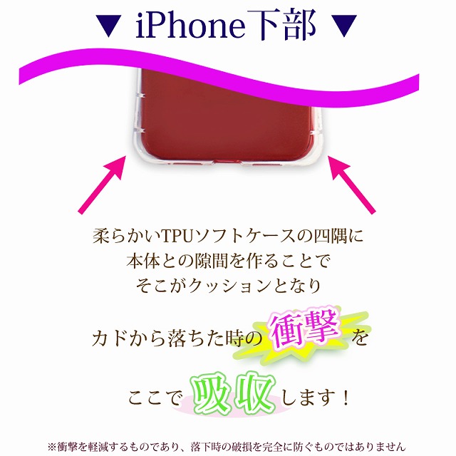 衝撃吸収クッション付TPUソフトケースなので、角から落としても衝撃を吸収して本体の破損を軽減します。