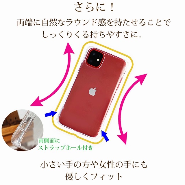 4隅に厚みを持たせて衝撃を吸収するような設計と、中心のくびれた部分が持ちやすく手にフィットしやすいTPU素材のソフトケースです。