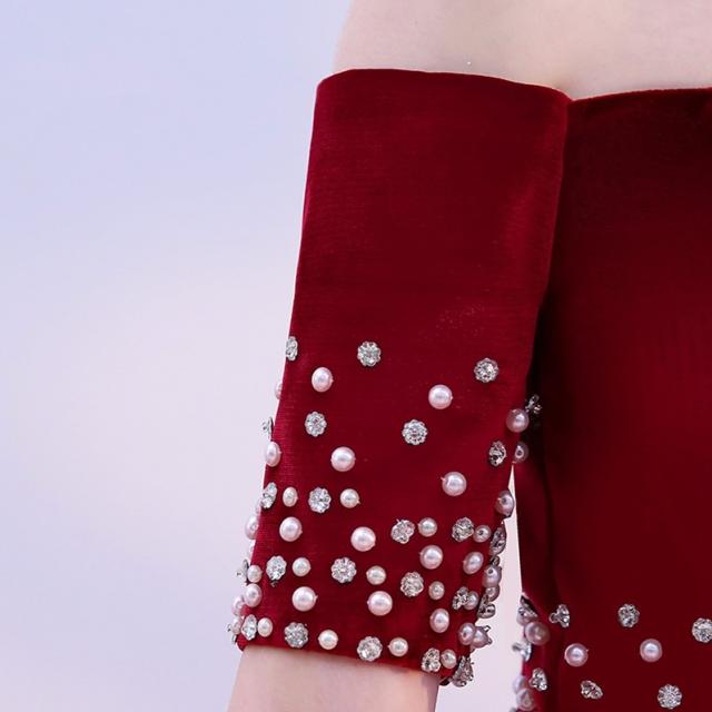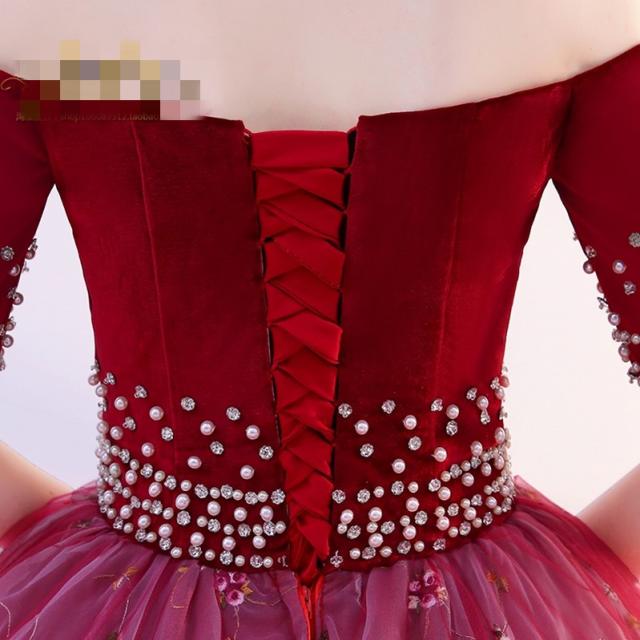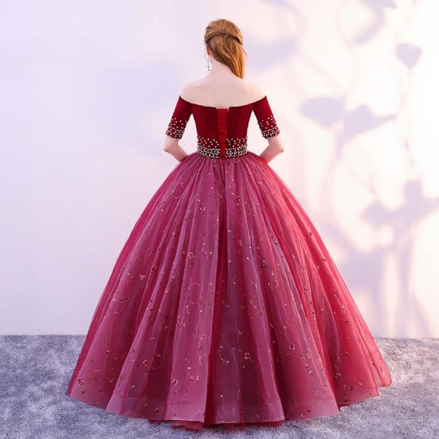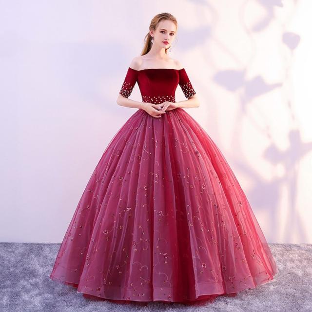 高品質 カラードレス ロングドレス パーティドレス ワンピ オフショルダー 赤 結婚式 二次会 発表会 パニエ付 オーダーサイズ可 D167