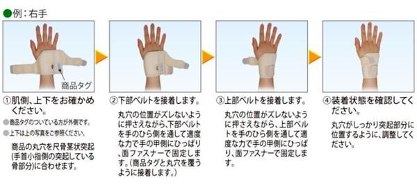 | 抗菌加工を施した伸縮生地を使用しています。上部ベルトと下部ベルトに分かれているため、症状にあわせて適度な場所で固定することができます。尺骨側と手の甲側にステーが配置されるので効果的な尺屈・背屈の可動制限が可能です。左右兼用で、面ファスナー接着により着脱も簡単に行えます。ソフトな素材で構成され、手首以外に負担をかけないので、ADLを制限しません。 |