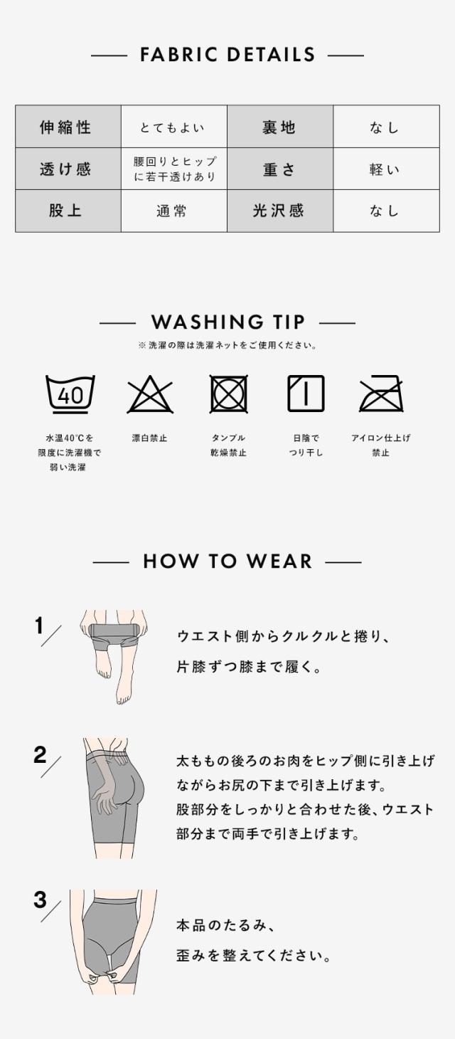 1.ウエスト側からクルクルとめくり、片足ずつ膝まで履いてください。