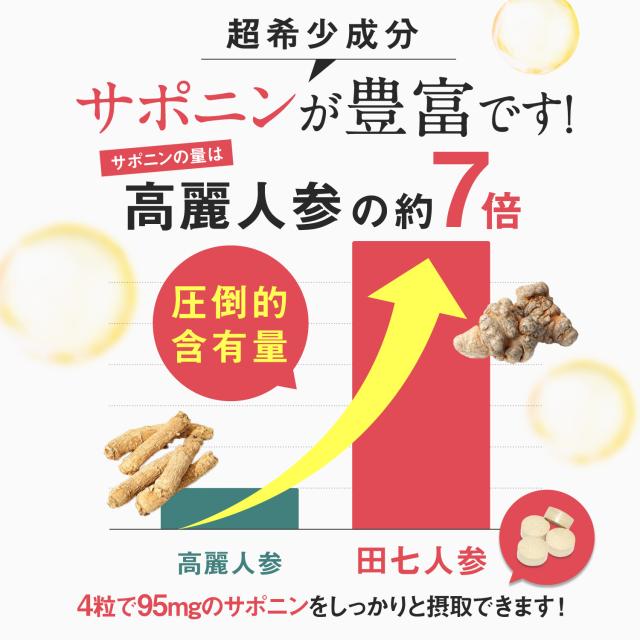 【成分】サポニン(ジンセノサイド) フラボノイド 必須アミノ酸 田七ケトン アミノ酸19種類 ビタミン ミネラル を配合!添加物を一切不使用でサポニンが4粒で95mg配合。