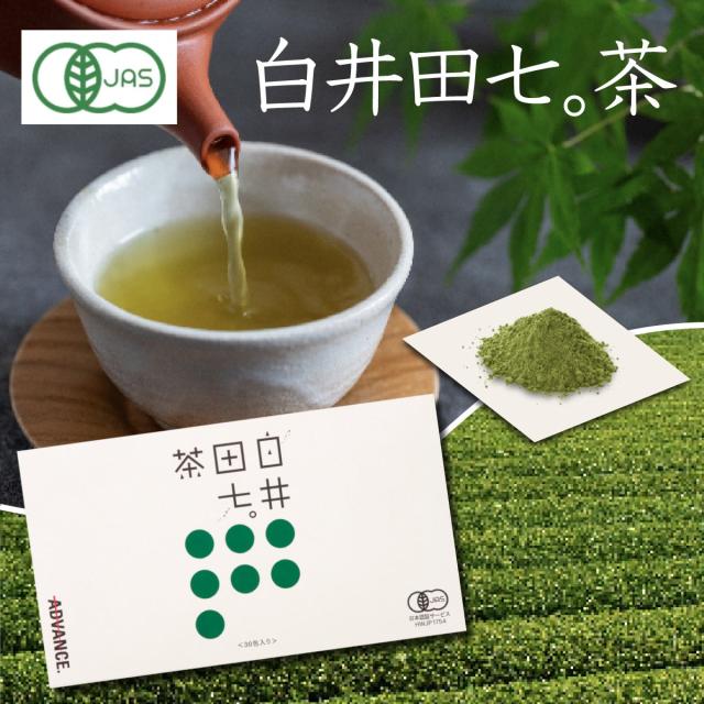 ・名称:有機田七人参入り粉末緑茶(白井田七。茶) 内容量:30g(1g×30包) 原材料:有機緑茶(98%)、有機田七人参(2%) 賞味期限:2年間 お召し上がり方:1日当たり1杯を目安に、お飲物と溶かしてお召し上がりください。500mlペットボトルに白井田七。茶を1包入れ、よく振ってお飲みください。