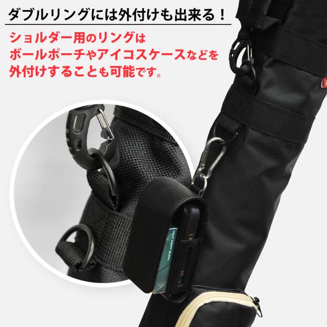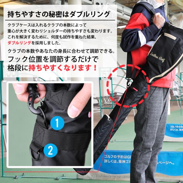 これを解決するために何度も試作を重ねた結果、クラブの本数やあなたの身長や肩幅に合わせて調節できるダブルリングを採用!