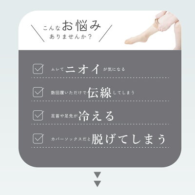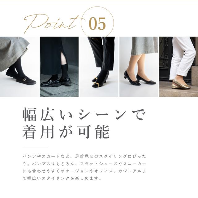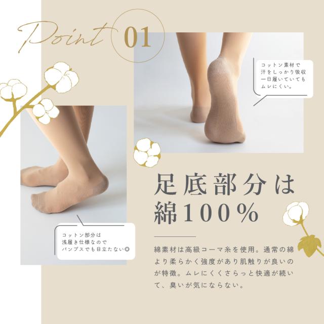 ストッキングを履いたようなくつしたです。 22-25cmの合わせやすいブラックとベージュの2色展開。 パンプススタイルや、クロップドパンツ、ガウチョなど 足元がみえるコーデでも冬でもおしゃれに楽しめます。 ふくらはぎから甲にかけての部分は、約35デニールのタイツのような生地。 素肌のような自然な色味で肌をキレイに魅せてくれます。 つま先や足裏部分は、綿素材なので汗を吸収してくれ 寒い冬も暖かいです。 |