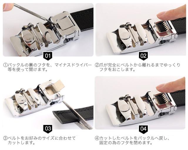 自動ロック式バックル採用で、ベルトをバックルに通すだけ!ワンタッチでお好みのサイズに調整できます。解除するときはバックルを引き上げるだけです。