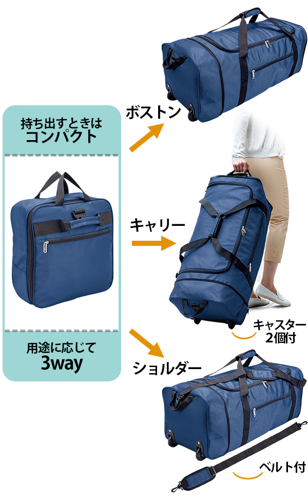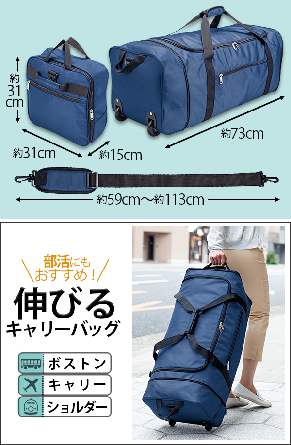 | 旅行や出張、買い物先で荷物が増えてしまった経験はありませんか!?そんな時におすすめなのが、伸びるキャリーバッグ。持ち出す時はコンパクト、用途に合わせて、キャスター2個・ベルト付なので、ボストン・キャリー・ショルダーになる3way!!荷物の多い部活用にもおすすめです!大容量/ビッグ/ビジネス/学生/スポーツ/トラベル/3通り/伸縮/かばん/カバン |