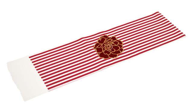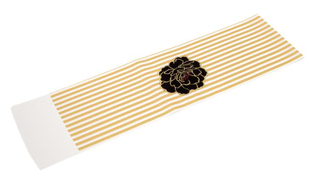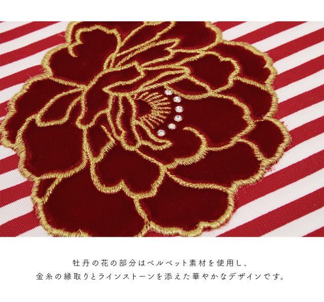 ストライプの上にラインストーンが飾られたベルベット生地は牡丹の花の形に縫い取りされた華やかなデザインです。