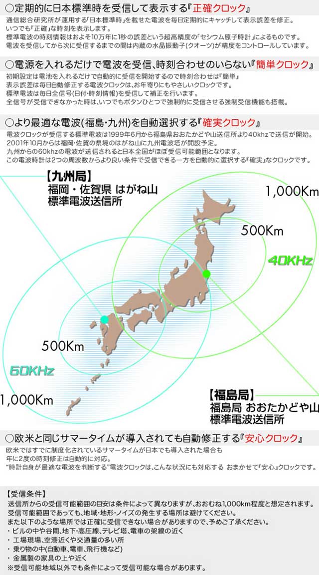 定期的に日本標準時を受信通信総合研究所が運用する「日本標準時」を載せた電波を毎日定期的にキャッチ。表示誤差を修正し、いつでも『正確』な時刻を表示します。