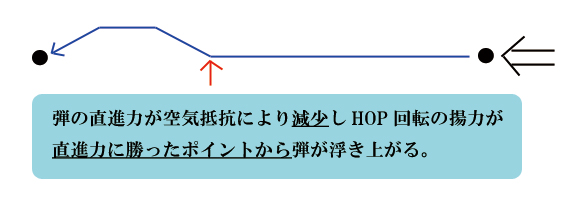 正しい表現に置き換えると、エア量UPは、飛距離を伸ばす為の基本要素となります。BB弾は発射された瞬間から「空気の壁」により抵抗を受け始めます。この空気の壁によって、BB弾は空気中に発射された瞬間から減速を始めます。HOP回転が掛かりながら減速を始めた弾は、空気の壁によって「直進力」が低下し一定以上の直進力を失った時点でHOP回転が揚力に勝ち、弾が浮き上がる原理となっています。