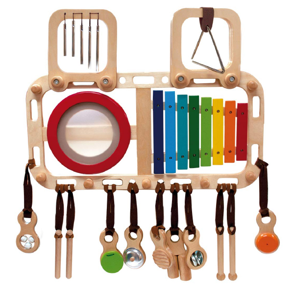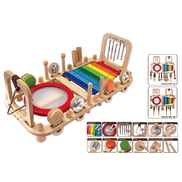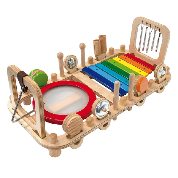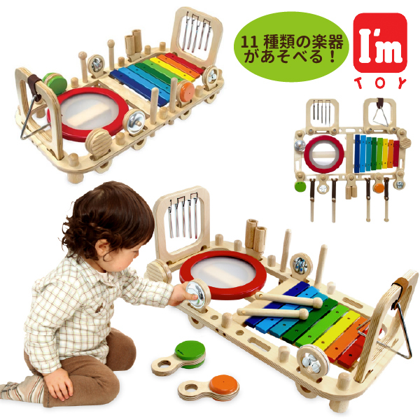 11種類の楽器で指先トレーニング 太鼓・木琴・トライアングル・チャイム・ベル・カスタネット・シンバル・ウッドブロック・ギロ・タンバリン・マラカスの11種類の音遊びが楽しめる大型トイです。