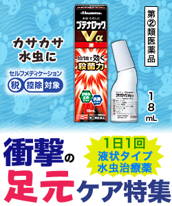 ◆特 長◆ ・水虫・たむしは、白癬菌というカビ(真菌)が皮膚表面の角質層に寄生しておこる疾患です。 白癬菌が皮膚表面の角質層等のケラチン質を侵すことによって激しいかゆみがおこります。 ・ブテナロックVα液は優れた効きめで水虫の原因菌(白癬菌)を殺菌する、水虫・たむし治療薬です。 優れた殺菌力「ブテナフィン塩酸塩」配合。かゆい水虫にも効く! ・角質層によく浸透し、水虫の原因菌(白癬菌)を殺菌します。 ・かゆみ止め成分「クロルフェニラミンマレイン酸塩」「ジブカイン塩酸塩」「クロタミトン」に加え、l-メントールのスーッとした使用感でかゆみを抑えます。 ・抗菌成分「イソプロピルメチルフェノール」配合。 ・炎症をおさめる「グリチルレチン酸」配合。 ・皮膚貯留性が優れている為、1日1回で効きます。 ・らく塗りボトル採用。 <ブテナロックVα液の適応例> 足の指の間の“カサカサ”した水虫に(趾間型) 水疱でつぶれていない水虫に(小水疱型) ※その他の症状にも使えます。 <液容器の使い方> ・使用前に、容器の先端を上に向けて、手の指で押して中の空気を抜いてください。 (暑い時期には内圧が高まり、薬液が多くでることを防ぐためです。) ・患部に使用する時は容器を下向き又は斜めにして、先端を患部に軽く押しあてて塗布してください。 (先端を患部からはなしますと、薬液がでなくなります。) ◆メーカー(※製造国または原産国)◆ 久光製薬株式会社 〒100-6330 東京都千代田区丸の内二丁目4番1号 お客様相談室 : 0120-133250(フリーダイヤル) 受付時間 : 9:00〜17:50(土・日・祝日・会社休日を除く) ※製造国または原産国:日本 ◆使用上の注意◆ ●してはいけないこと (守らないと現在の症状が悪化したり、副作用が起こりやすくなります。) 1.次の人は使用しないでください。 本剤又は本剤の成分によりアレルギー症状を起こしたことがある人。 2.次の部位には使用しないでください。 (1)目や目の周囲、粘膜(例えば口腔、鼻腔、膣等)、陰のう、外陰部等。 (2)湿疹。 (3)湿潤、ただれ、亀裂や外傷のひどい患部。 ●相談すること 1.次の人は使用前に医師、薬剤師又は登録販売者にご相談ください。 (1)医師の治療を受けている人。 (2)妊婦又は妊娠していると思われる人。 (3)乳幼児。 (4)薬などによりアレルギー症状を起こしたことがある人。 (5)患部が顔面又は広範囲の人。 (6)患部が化膿している人。 (7)「湿疹」か「みずむし、いんきんたむし、ぜにたむし」かがはっきりしない人。 (陰のうにかゆみ・ただれ等の症状がある場合は、湿疹等他の原因による場合が多い。) 2.使用後、次の症状があらわれた場合は副作用の可能性がありますので、直ちに使用を中止し、この説明書を持って医師、薬剤師又は登録販売者にご相談ください。 [関係部位:症状] 皮膚:発疹・発赤、かゆみ、かぶれ、はれ、刺激感、熱感、落屑、ただれ、水疱、乾燥感、ヒリヒリ感、亀裂 3.2週間位使用しても症状がよくならない場合は使用を中止し、この説明書を持って医師、薬剤師又は登録販売者にご相談ください。 ◆効果・効能◆ みずむし、いんきんたむし、ぜにたむし ◆用法・用量◆ 1日1回、適量を患部に塗布してください。 <用法・用量に関連する注意> (1)患部やその周囲が汚れたまま使用しないでください。 (2)目に入らないように注意してください。万一、目に入った場合には、すぐに水又はぬるま湯で洗い、直ちに眼科医の診療を受けてください。 (3)小児に使用させる場合には、保護者の指導監督のもとに使用させてください。 (4)外用にのみ使用してください。 ◆成 分◆ 1mL中 ブテナフィン塩酸塩 10mg、ジブカイン塩酸塩 2mg、クロルフェニラミンマレイン酸塩 5mg、グリチルレチン酸 2mg、l-メントール 20mg、クロタミトン 10mg、イソプロピルメチルフェノール 3mg 添加物 : エタノール、マクロゴール <成分に関連する注意> アルコールを含んでいますので、塗布時にしみることがあります。 ◆保管及び取扱い上の注意◆ (1)直射日光の当たらない涼しい所に密栓して保管してください。 (2)小児の手の届かない所に保管してください。 (3)他の容器に入れ替えないでください(誤用の原因になったり、品質が変わることがあります)。 (4)表示の使用期限を過ぎた商品は使用しないでください。なお、使用期限内であっても開封後は品質保持の点からなるべく早く使用してください。 (5)火気に近づけたり、火の中に入れたりしないでください。また、使用済みの容器は火中に投じないでください。 (6)合成樹脂(スチロール等)を軟化したり、塗料を溶かしたりすることがありますので、バッグや床、家具などにつかないようにしてください。 ※その他、医薬品は使用上の注意をよく読んだ上で、それに従い適切に使用して下さい。 ※ページ内で特に記載が無い場合、使用期限1年以上の商品をお届けしております。 |