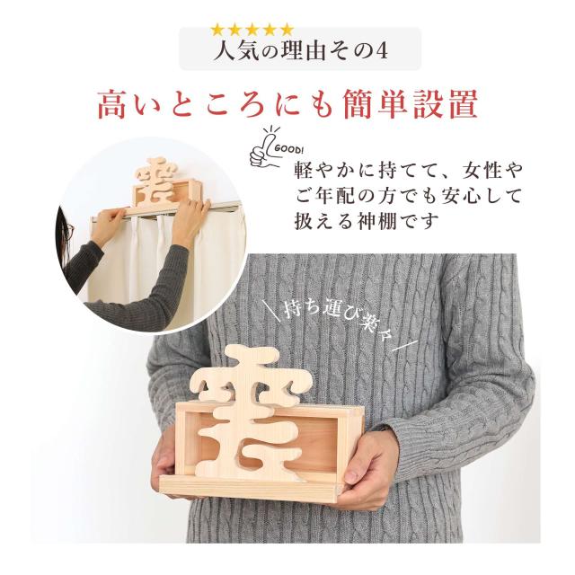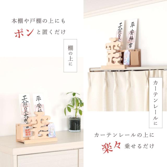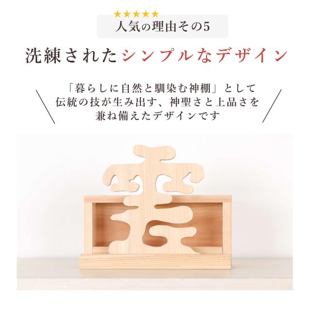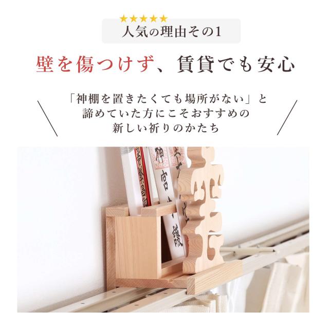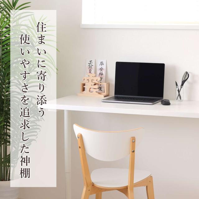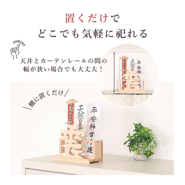 もちろん本棚や戸棚の上などにポンと置いても美しく、インテリアにすっと馴染むデザイン。届いてすぐに、かんたんに、神棚が出来上がります。
