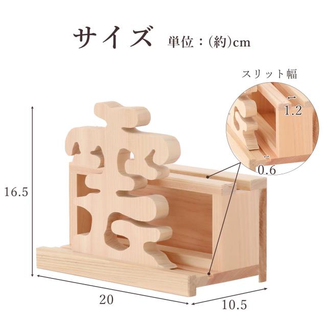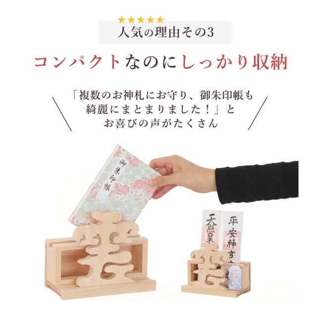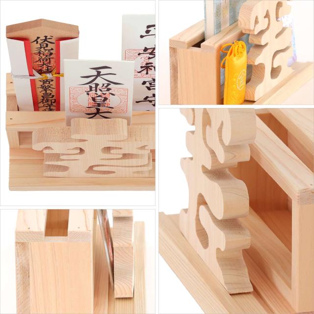 本体はお札を立てる溝が2列あり、手前に1枚と奥に2枚、合計3枚のお神札を収納します。またお守りや縁起小物も一緒に添えて、神様の近くに。
