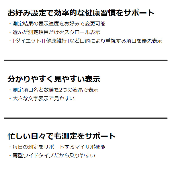 お好み設定で効率的な健康習慣をサポート ■計量範囲:0 〜 150 kg ■主な付属品:取扱説明書(保証書付)、お試し用電池(単3形アルカリ乾電池(LR6)×4本) ■主な材質:ABS、AS、PE、ステンレス ■表示文字高:17 mm / 40 mm ■電源:DC6V 単3形アルカリ乾電池(LR6)×4本 ■消費電流:最大 30 mA ■商品寸法:幅 310mm × 高さ 33mm × 奥行 274mm ■本体質量:約 1.3kg ※記載は商品仕様の一部です。仕様説明不足等の理由での返品はできません。特に適合等は必ずご確認ください。