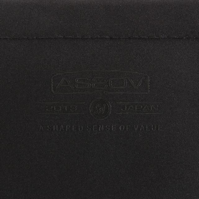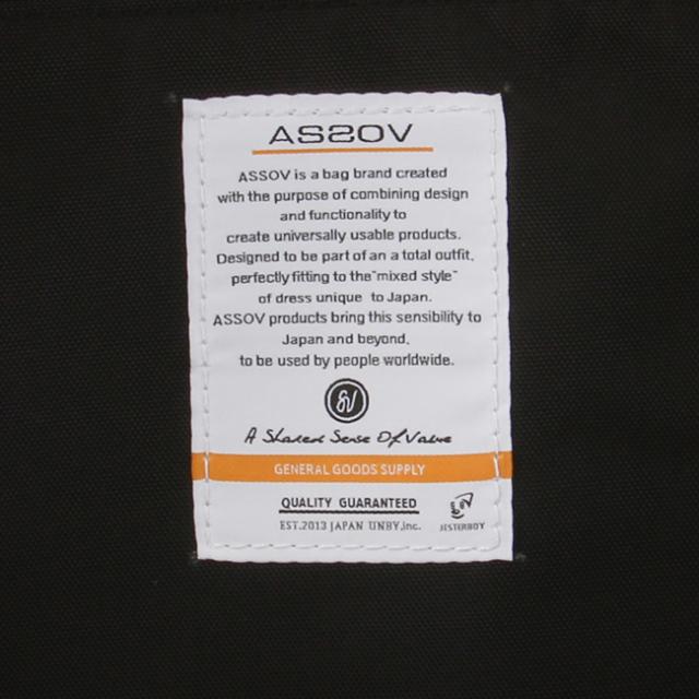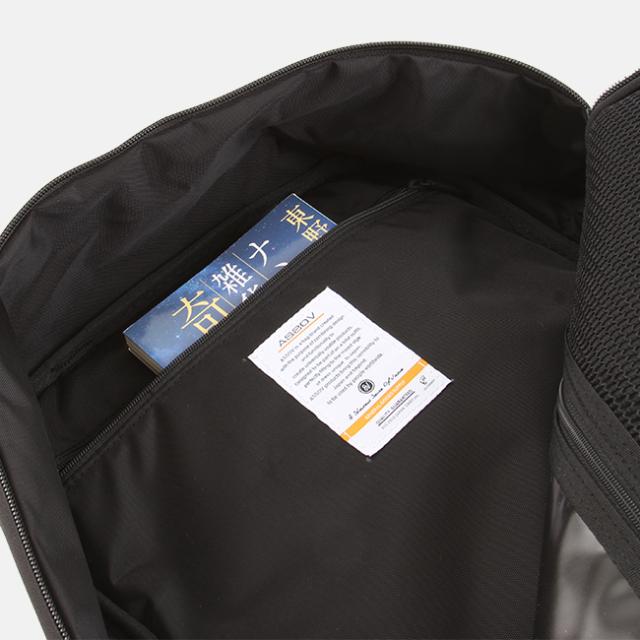 | フロントにスマホなどの小物が入るファスナーポケットと、13インチノートPCが入るファスナーポケットを装備。 | メインルーム内装に大きなアッソブのブランドタグが縫い付けられています。 |