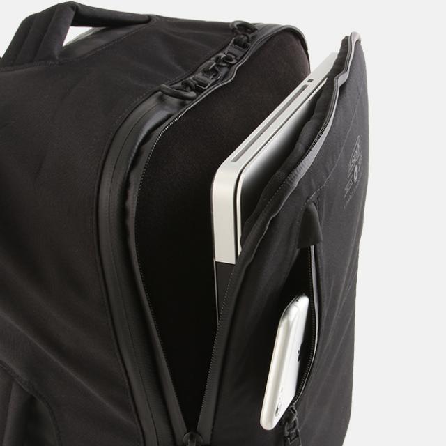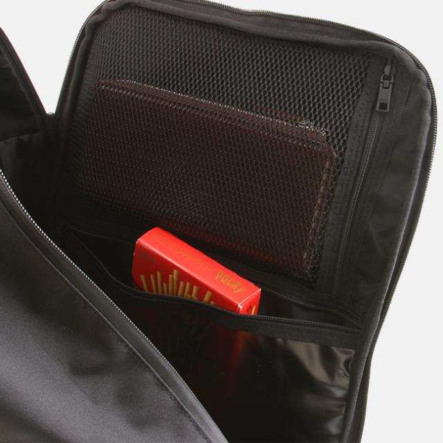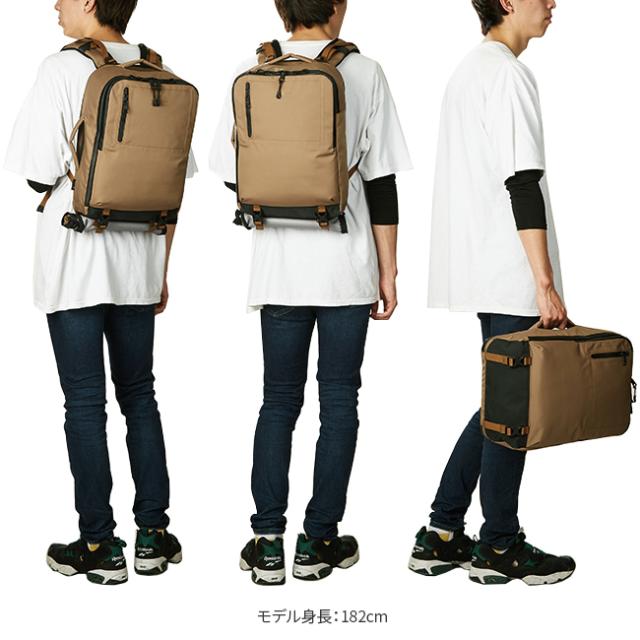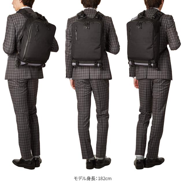 | オンオフ使用出来る2WAYタイプのスクエア型リュックです。ビジネス使用時は背面のジップでショルダー部分をすべて隠すことが出来ます。PCポケットも完備し、PCポケットのインナー部分は起毛素材になっているので、ケース無しでPCを収納できます。ショルダーパッド、背面部分等にクッション材を入れ裏面にストレッチ素材を使用することで使用時に肩への負担を軽減。機能的、さらに軽量なのでビジネス、通勤、旅行、すべてのシーンをサポート出来ます。内装ポケットには13インチ (MacBook基準)のデバイスが収納できます。 ※本体素材には3レイヤー加工を施した防水生地を使用しておりますが、シームテープ加工の施されていな箇所では縫製部分から侵入する事がございます。 |
