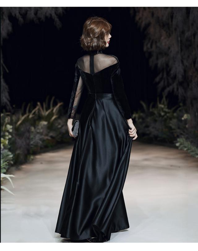 エレガント ロングドレス パーティドレス ワンピ ナイトドレス オフショルダー 7分袖 黒 ベロア 結婚式 二次会 発表会 演奏会 撮影 D175