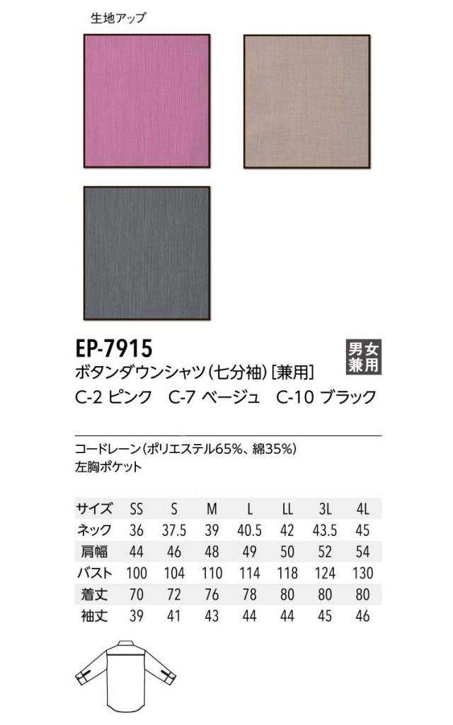 飲食サービス系ユニフォーム アルベ arbe チトセ chitose兼用 ボタンダウンシャツ(七分袖) EP-7915 通年