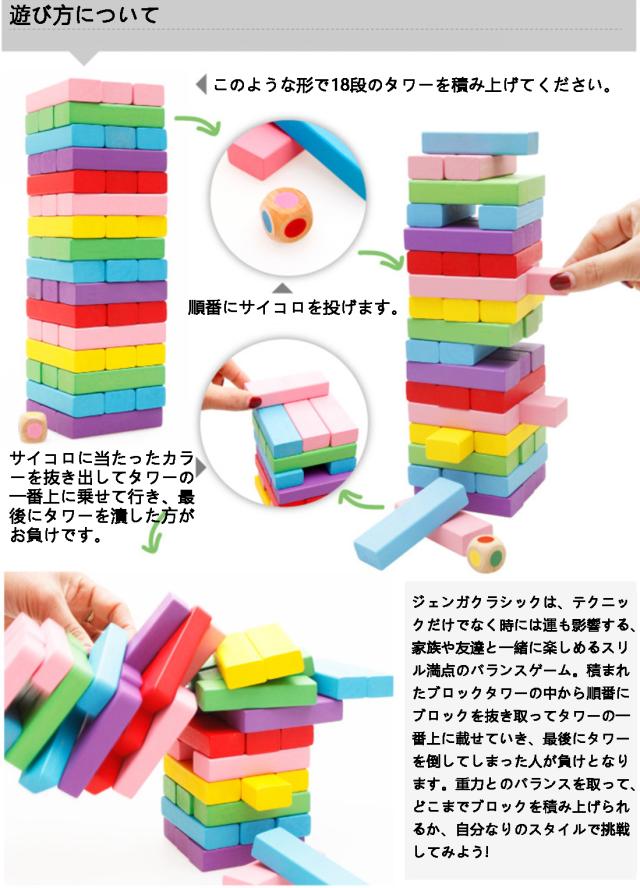 木製 ジェンガ 6色 48ピース 知育玩具 子供 大人 おもちゃ 積み木・ドミノ・ブロックとしても遊べる アンバランス