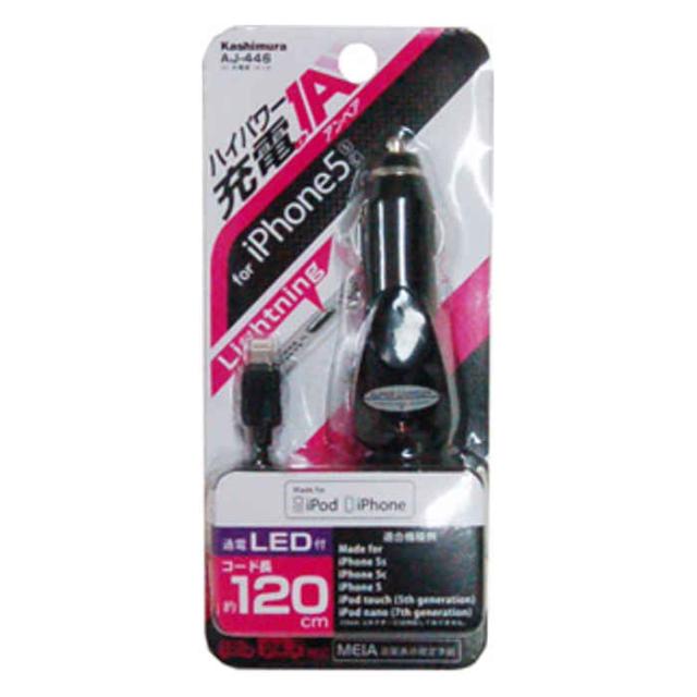 車のシガーライターソケットからLightningコネクタのiPhone/iPodをハイパワー1Aで充電可能なDC充電器。赤く光る通電ランプ付き。ストレートコードタイプ。Apple社 MFi認証品。*Dockコネクタには対応しておりません。
