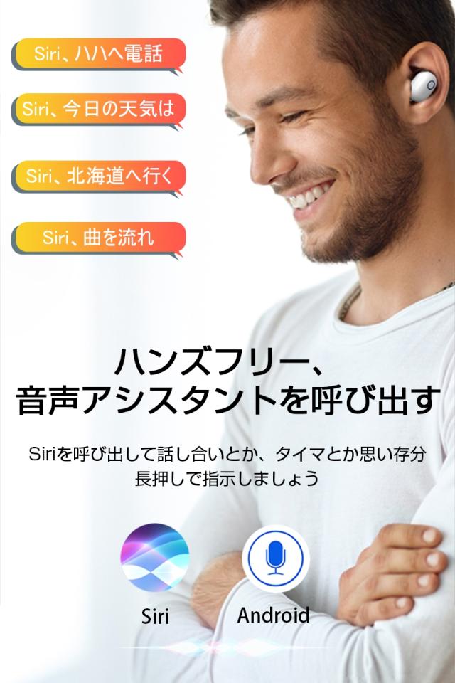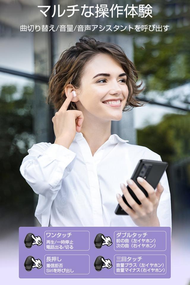 【タッチコントロール】タッチコントロール式bluetoothイヤホン、高感度なパネルと高品質な部品を採用し、タッチパネルをタッチするだけで、音楽再生/一時停止、通話開始/終了/拒否/次の曲/Siri起動などの操作をすべて実現可能。